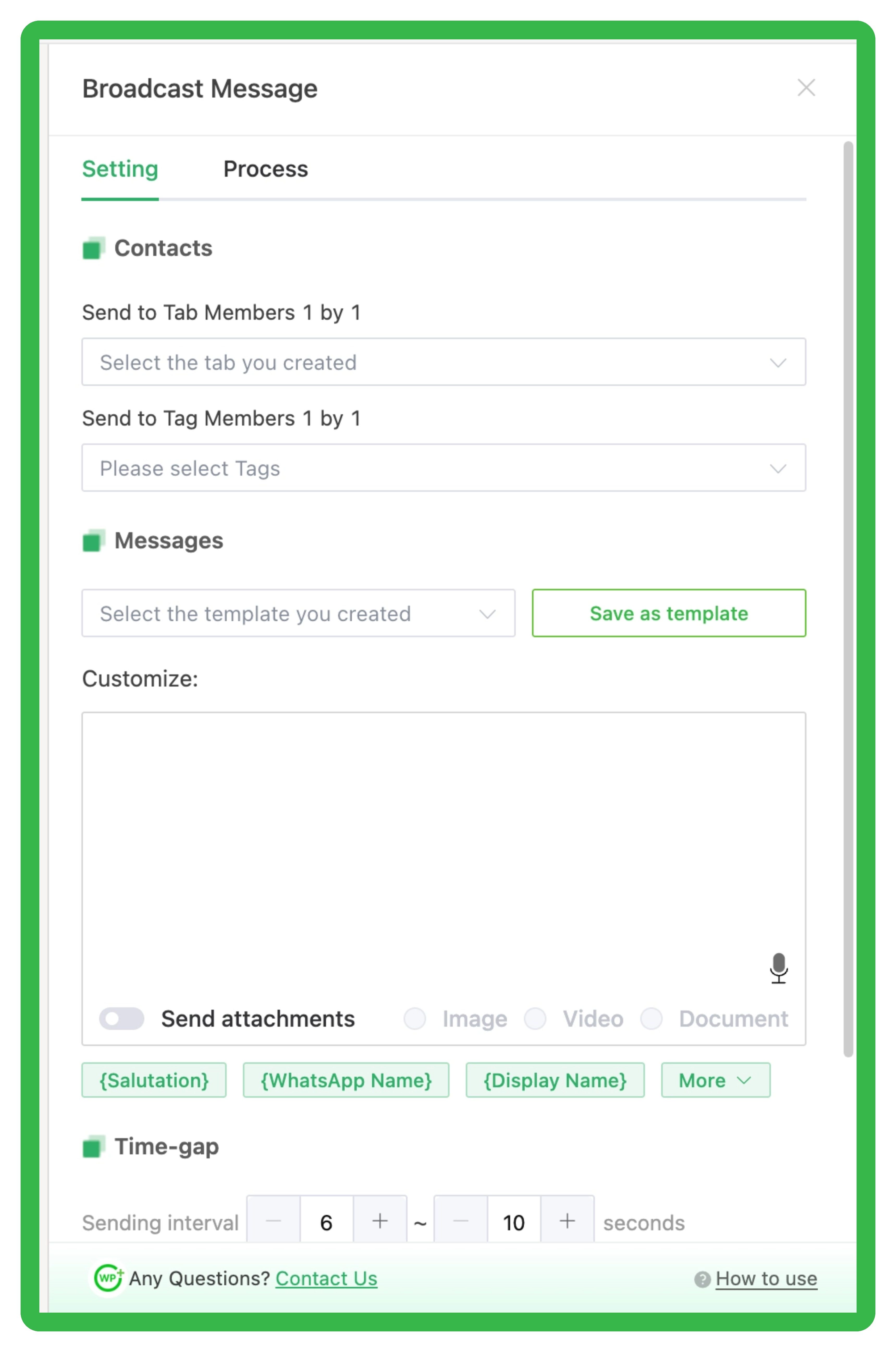 You can choose to add WhatsApp number, contact name, timestamp to personalize the messages;