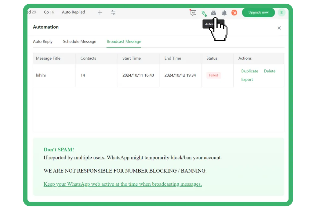 automation tab, where you can check the status of broadcast messages.