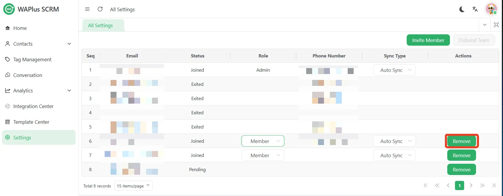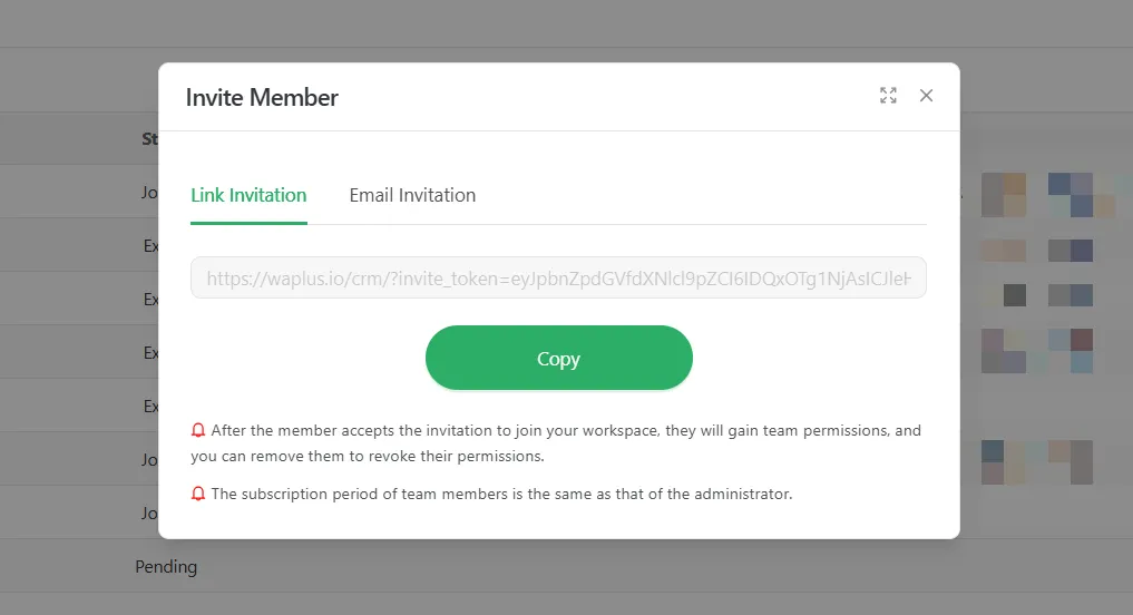 Step 1:Navigate to https://waplus.io/crm/v2/setting and click on Invite Members.
