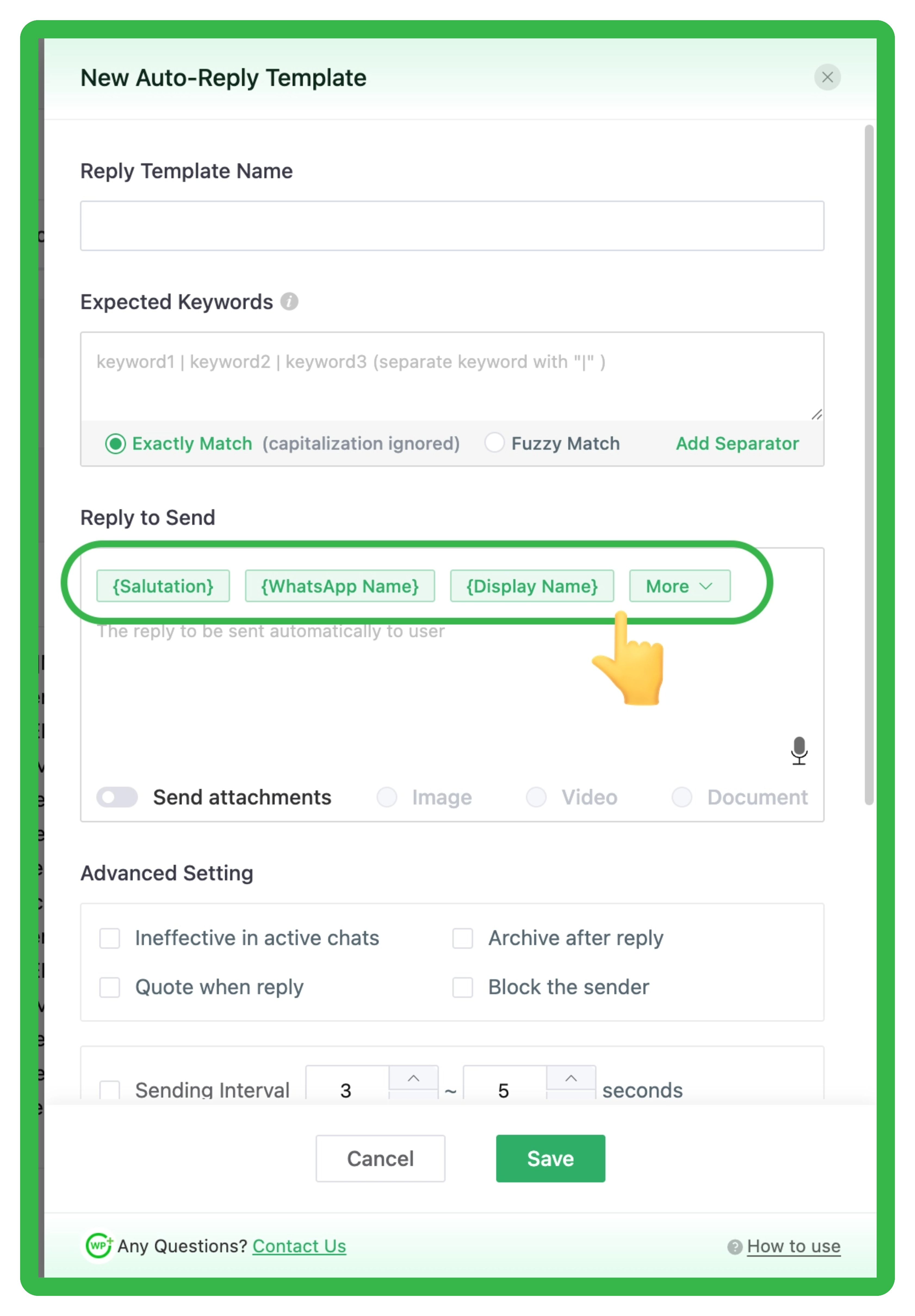 Message placeholders let you quickly insert dynamic fields into outgoing messages, which are automatically replaced with the actual contact or chat details when sent. Placeholders enhance automation and personalization for Auto Reply, Quick Reply, and Broadcast features.