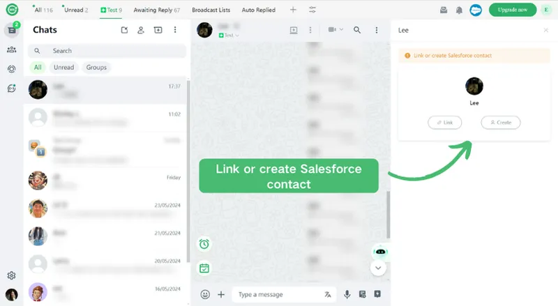 Open a chat, and click on the Salesforce, you can link or create contacts with 1 click;