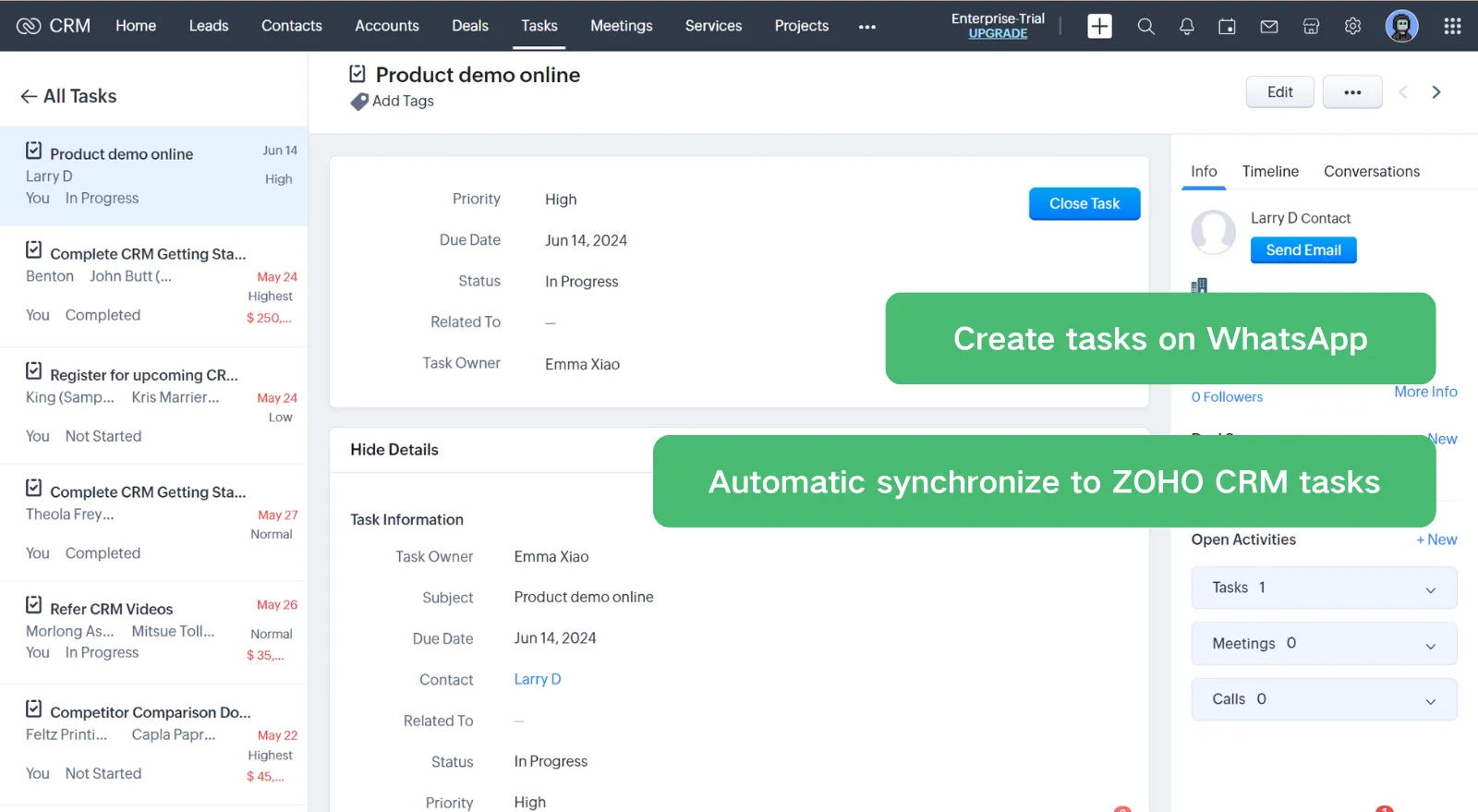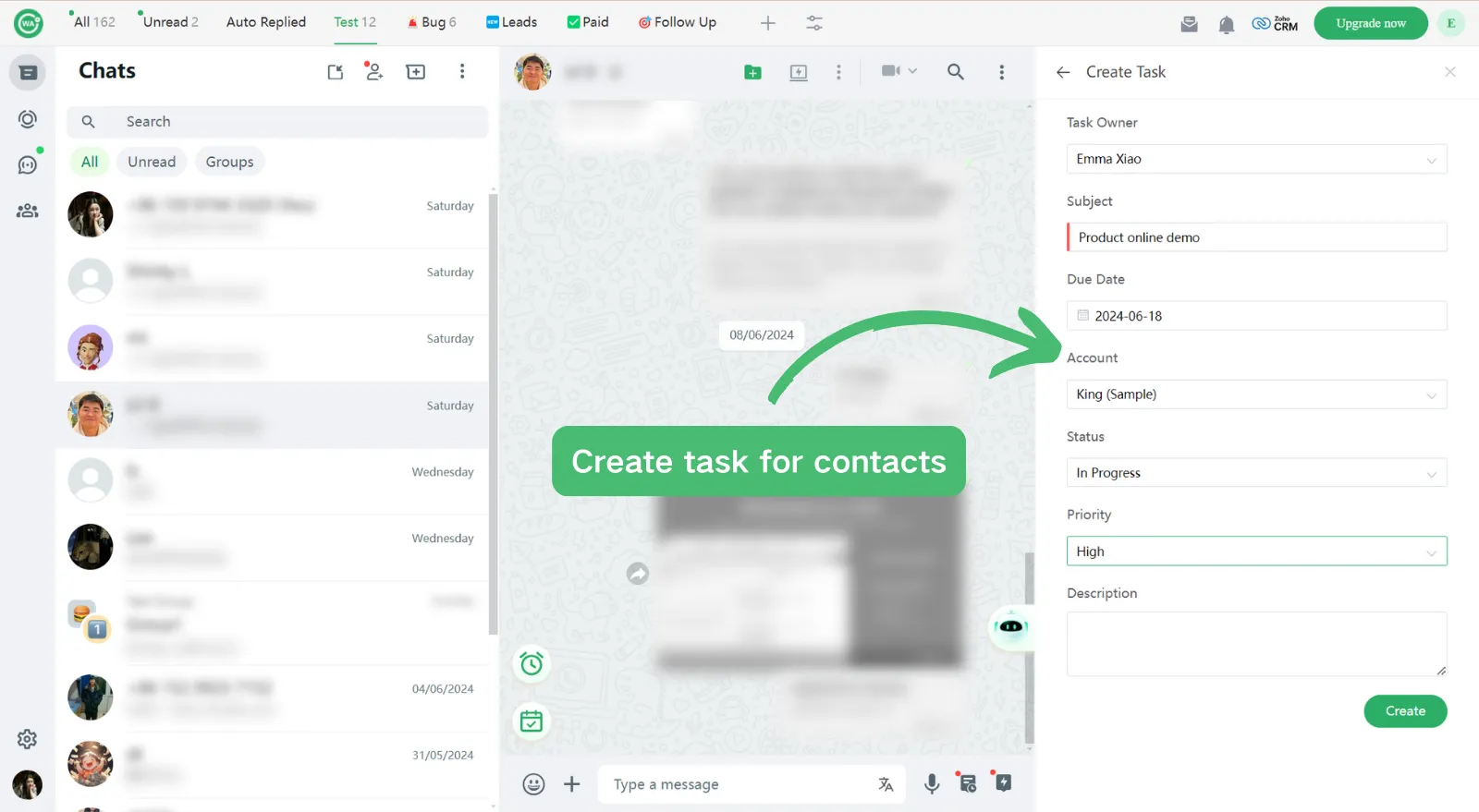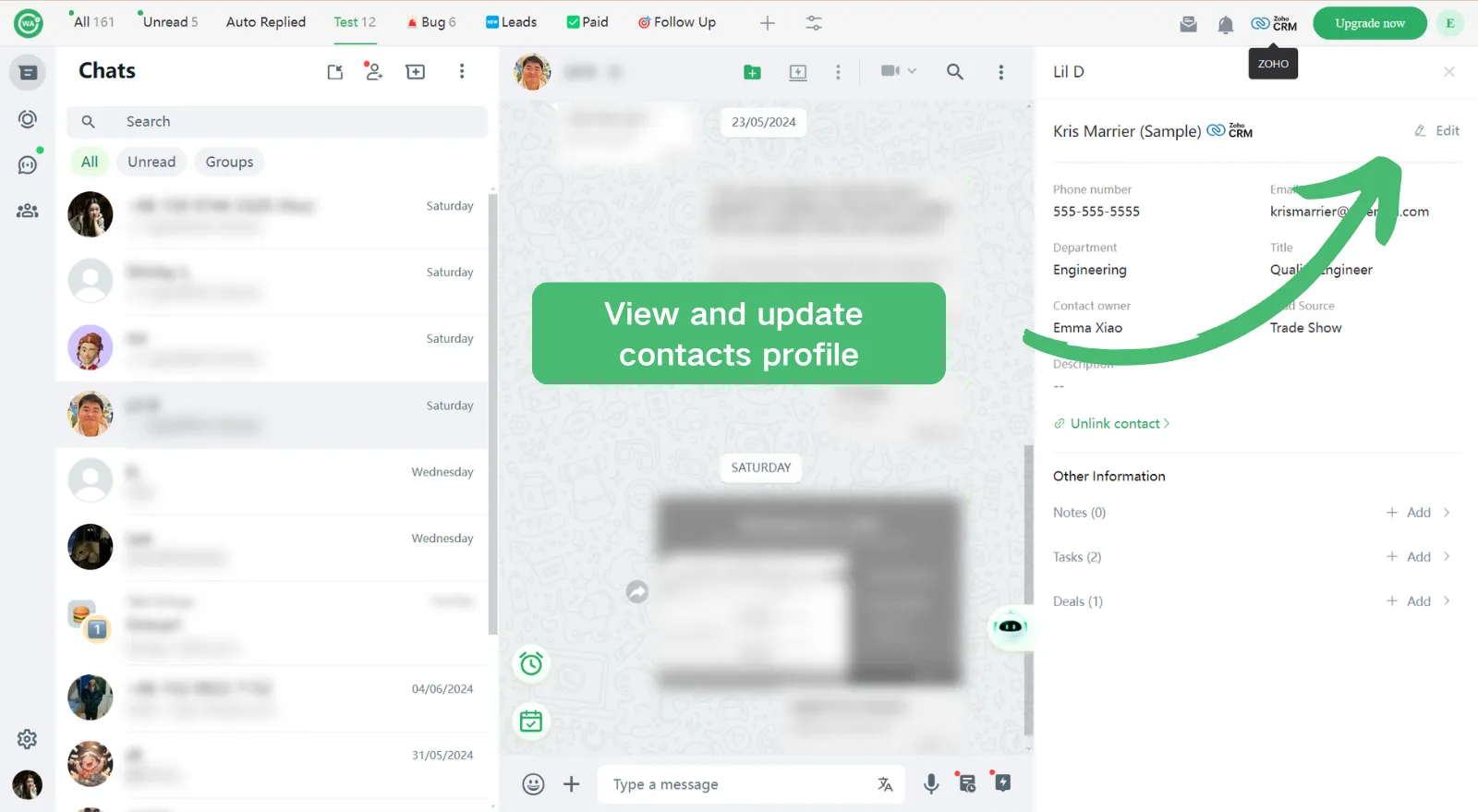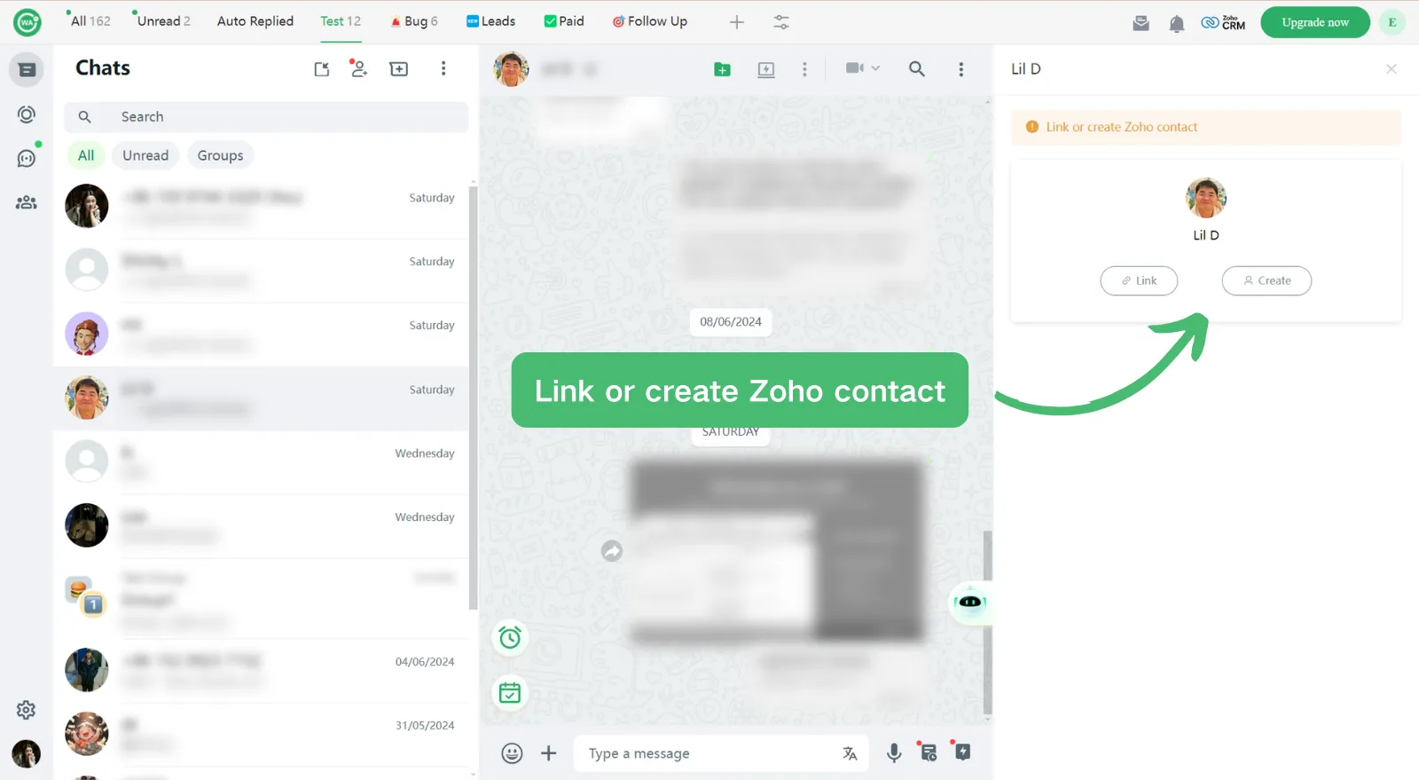 Open a chat, and click on the Zoho, you can link or create contacts with 1 click;