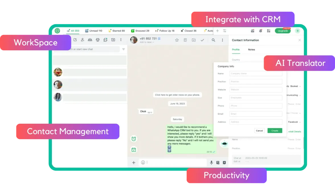 Potencialize sua produtividade no WhatsApp com CRM do WhatsApp impulsionado por IA que ajuda indivíduos e equipes a organizar chats, automatizar mensagens com chatbot de IA e agendador do WhatsApp, e integrar WhatsApp com suas ferramentas CRM favoritas no WhatsApp Web.